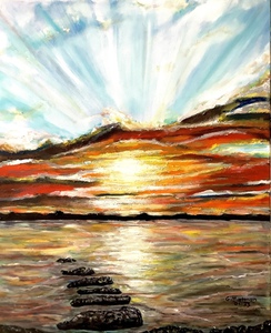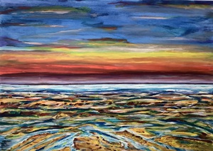 2023Een kleurrijk schouwspel, tegen de avond trekt het water zich terug. Wat onder water was, wordt nu zichtbaar. Geulen in het zand... De natuur is in beweging...